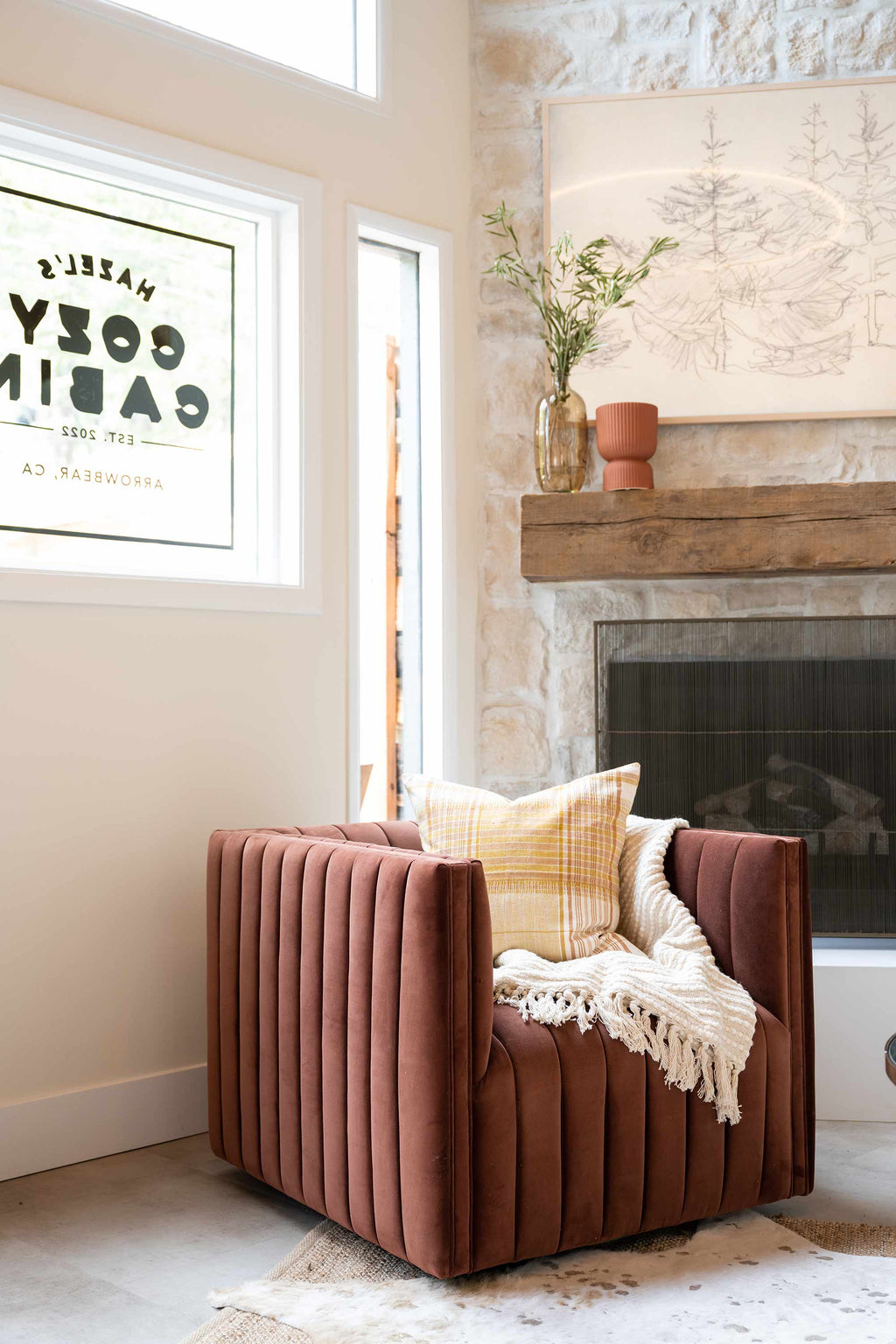 I think we’ve started to see more soft lines and organic curves as an interior design trend these past few years. From innovative furniture designs to arches in doorways, soft lines offer a unique visual element to your home. The Shop by Jasmine Roth has a few standout pieces with organic curves—our Freeport Swivel Chair is a favorite of mine that I’ve used in numerous projects (including Hazel’s Cozy Cabin!) along with our Freeport Ottoman.