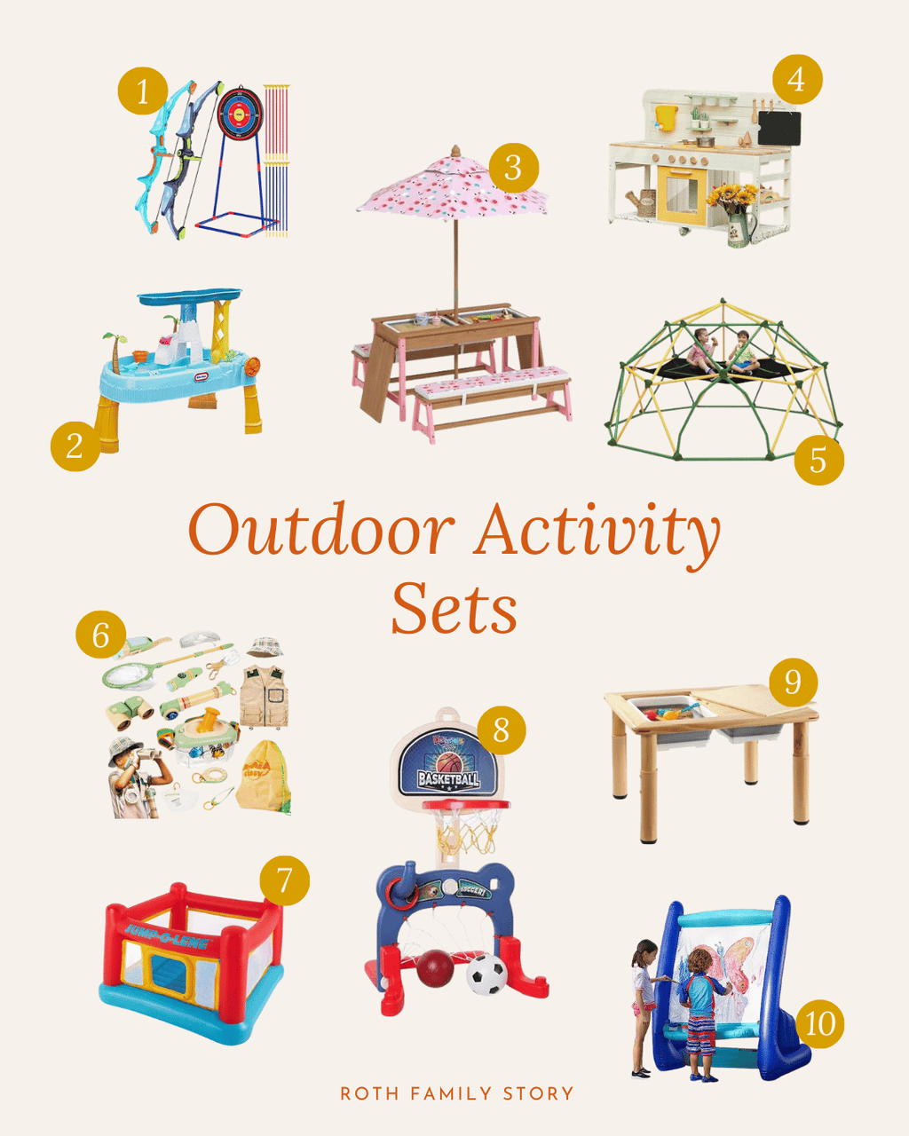 1. 2 Pack Bow & Arrow Set // 2. Waterfall Island Activity Table // 3. Activity Picnic Table with Umbrella // 4. Kitchen Outdoor Set // 5. Climbing Dome with Tent // 6. 27 Piece Kids Explorer Kit // 7. Inflatable Trampoline Bounce House // 8. 3 in 1 Sports Play Set // 9. Height Adjustable Sensory Table // 10. Double Sided Inflatable Art Easel // Shop All