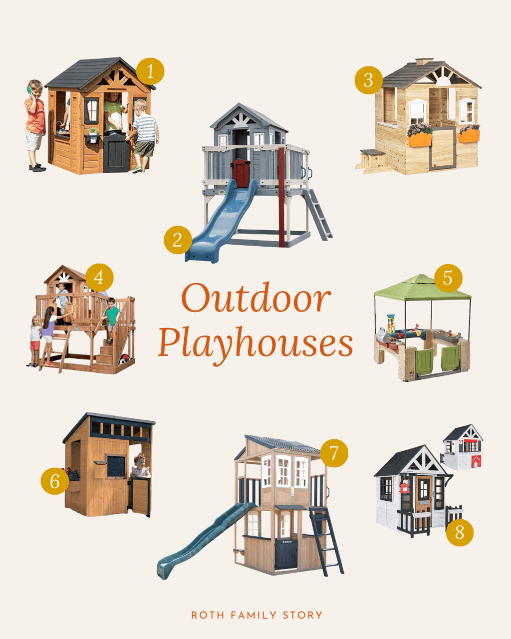 1. Cedar Wooden Playhouse // 2. Blue Wooden Cedar Playhouse // 3. Garden Cottage Playhouse // 4. Wrap-Around Deck Playhouse // 5. Kitchen Sensory Playhouse // 6. Modern Farmhouse Playhouse // 7. Two Story Playhouse with Slide // 8. White Wooden Playhouse with Pet Door // Shop All