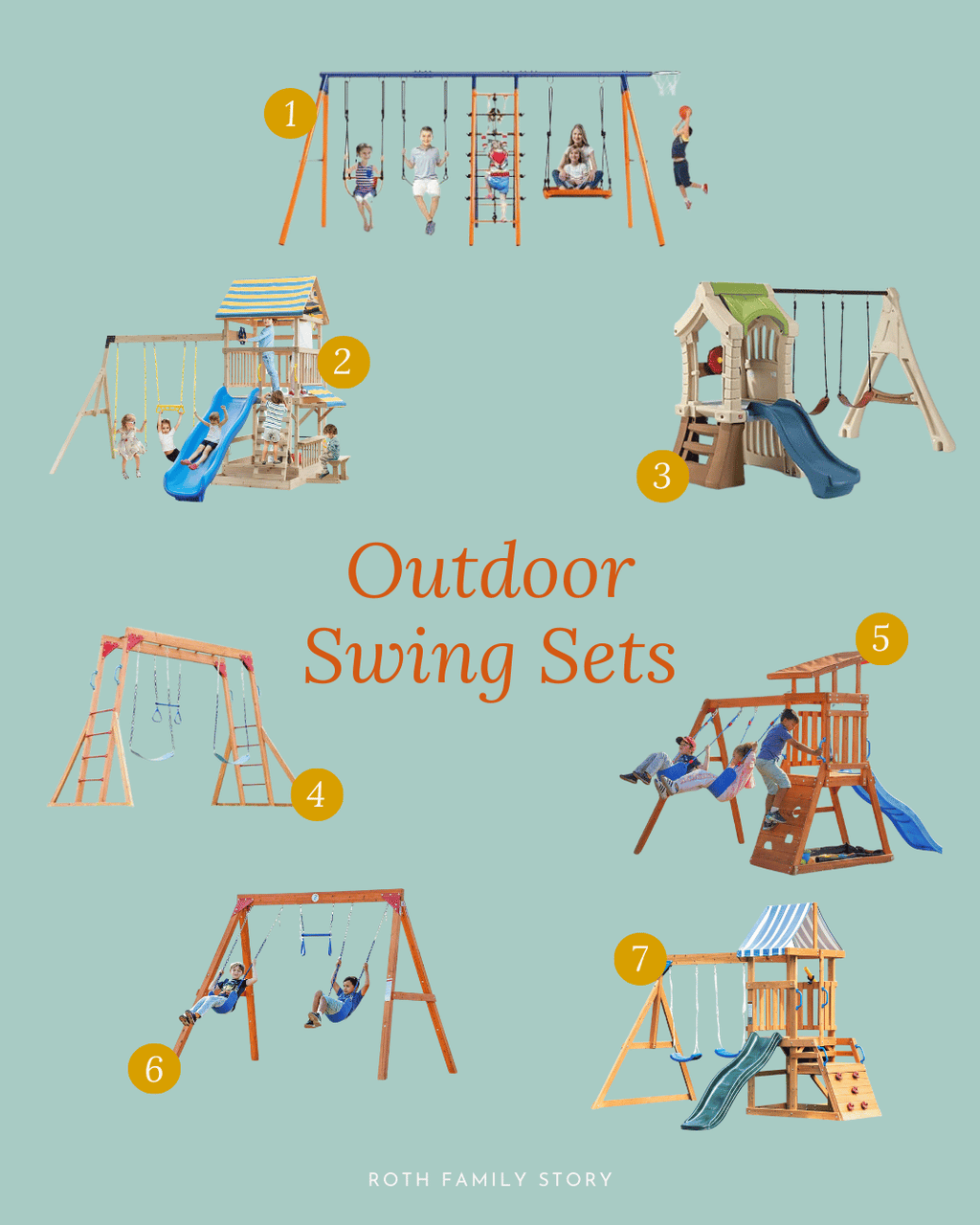 1. 6 in 1 Multifunction Swing Set // 2. Outdoor Play Center with Swings, Slide, Monkey Bars & more // 3. Toddler Swing Set // 4. Swing Set with Trapeze Swing // 5. Small Swing Set with Climbing Wall // 6. Minimal Outdoor Swing Set // 7. All in One Wooden Swing Set // Shop All