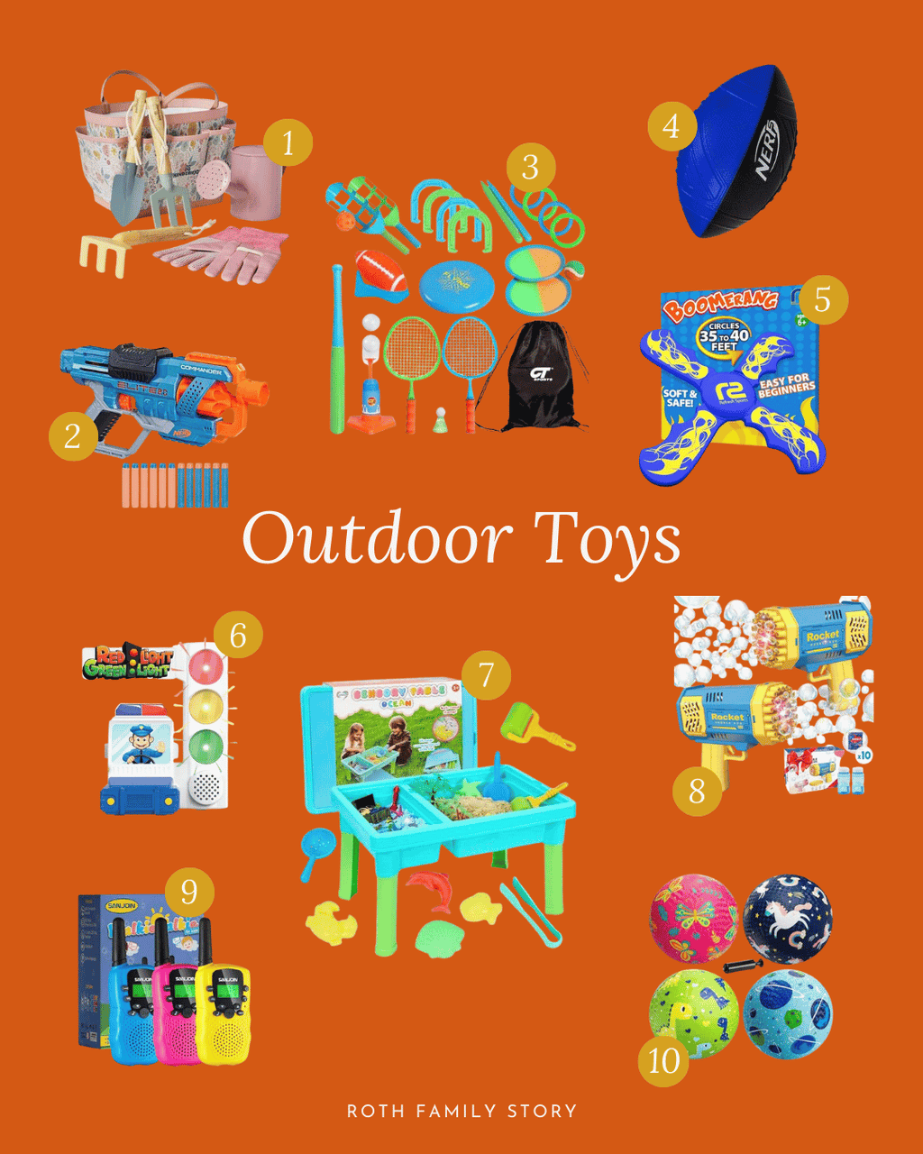 1. Gardening Set // 2. Nerf Dart Blaster // 3. 8 in 1 Sports Toys // 4. Nerf Pro Football // 5. Boomerang // 6. Red Light Green Light Game // 7. Ocean Sensory Table // 8. Bubble Machine Wands // 9. 3 Pack Walkie Talkies // 10. 4 Pack Kickball Set // Shop All