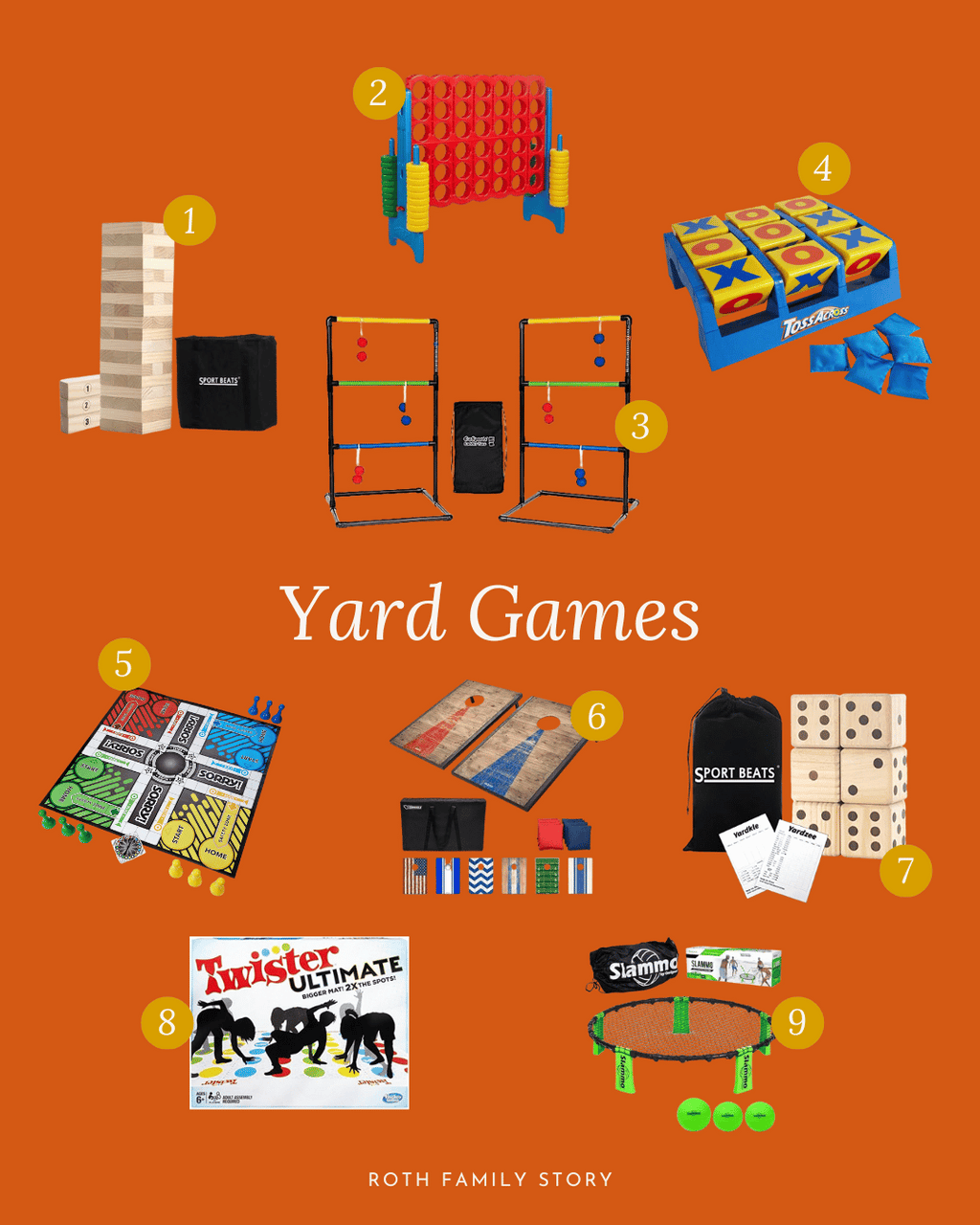 1. 54 Block Tower Game // 2. Jumbo 4 to Score // 3. Ladder Toss Game // 4. Tic-Tac-Toe Toss Across Game // 5. Giant SORRY! Outdoor Board Game // 6. 8 in 1 Portable Set // 7. Giant Wooden Yard Dice // 8. Twister Ultimate // 9. Slammo Game Set // Shop All